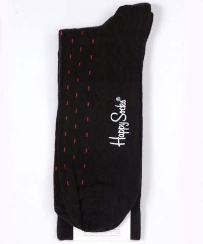 Pair of dashed line socks in black. The main body of the sock is black, with a dashed red line