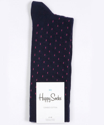 Pair of dashed line socks in navy blue. The main body of the sock is navy, with a dashed pink line.